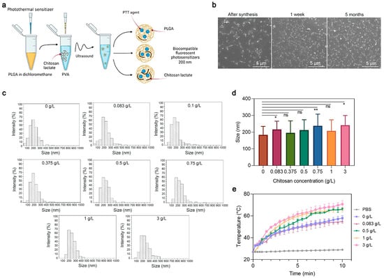 Synthesis and characterization of PLGA nanoparticles. (a) Scheme of PLGA nanoparticle synthesis. A mixture of PLGA and Pht-Mg in dichloromethane was poured into the PVA solution containing chitosan lactate oligosaccharide at different concentrations and sonicated. (b) Scanning electron microscopy images of PLGA/Pht-Mg NP obtained right after synthesis, 1 week after and 5 months after synthesis. (c) Size distribution of PLGA/Pht-Mg nanoparticles with various chitosan lactate concentrations used during the synthesis, obtained via SEM image processing. (d) The average size of nanoparticles with various chitosan lactate concentrations used during the synthesis, obtained via SEM image processing. Data presented are mean ± s.d. * p < 0.05, ** p < 0.01, ns p ≥ 0.05, Paired two-sample t-test for mean. (e) Photothermal properties of PLGA/Pht-Mg nanoparticles synthesized with chitosan lactate at the concentrations 0 g/L; 0.08 g/L; 0.5 g/L; 1 g/L; and 3 g/L.