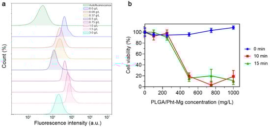 Study of PLGA/Pht-Mg NP interactions with EMT6/P cells. (a) Flow cytometry analysis of PLGA/Pht-Mg NP binding efficiency to EMT6/P cells. (b) Cytotoxicity of PLGA/Pht-Mg NP under 808 nm laser light irradiation, measured by a resazurin test.
