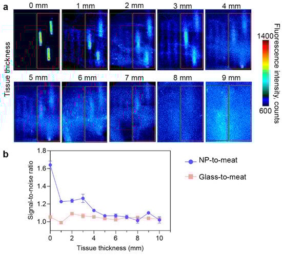 Bioimaging study of PLGA/Pht-Mg NP ex vivo. (a) Fluorescent images of empty glass capillaries (shown in the red frame) and glass capillaries with PLGA/Pht-Mg NP (shown in the green frame) covered with turkey fillet. (b) Fluorescence intensity of PLGA/Pht-Mg NP at different tissue depths. Dots represent the signal-to-noise ratio of the fluorescence intensity from capillaries with PLGA NPs or empty glass capillaries to meat.
