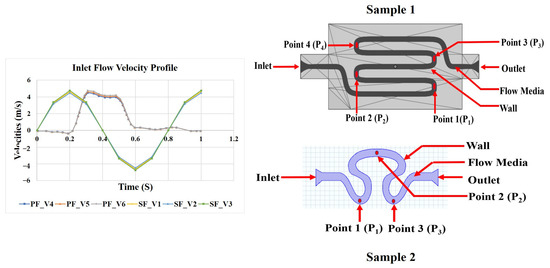A schematic representation of two different serpentine channels is shown in Figure 1: S-shaped serpentine (model S1) and delta-shaped serpentine (model S2). It also shows the inlet flow boundary conditions, namely, pulsatile and sinusoidal. Mean arterial pressures of 80, 85, and 90 mmHg were considered for this study [29,30]. These pressure values were converted into their corresponding inlet velocities for serpentine geometries 1 and 2. Three different flow rates (corresponding to systolic, diastolic, and mean arterial pressure) based on the transient inlet velocity functions of sinusoidal (SF; V1, V2, and V3) and physiological (PF; V4, V5, and V6) were considered in the study [31]. The physiological functions (waveform) were derived from 4D Laser Doppler data of blood flow across the cross section of the subclavicular artery of a healthy subject. The study was approved by the Institute Ethical Committee (NITRR/IEC/2021/12). The obtained temporospatial functions were interpolated thereafter using the curve-fitting MATLAB 2021a toolbox. Further, the interpolated function with the lowest root mean square error (RMSE) value was selected for the study. The functions corresponding to the inlet flow velocity conditions for V1 to V6 are given in Table 1. One complete cycle of both sinusoidal and physiological flows is equivalent to the required simulation time, as represented by T [31]. Different study models were formulated for S1 and S2 as tabulated in Table 2.