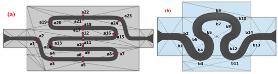 Higher values of OSI in the non-Newtonian fluid formulation was due to the presence of nonlinearity in the rheological behavior of the non-Newtonian viscosity fluid. At point a10 for the non-Newtonian viscosity formulation of serpentine model S2, the shear rate was higher, which enhanced the power-law index, causing an increase in the OSI magnitude. In the case of Newtonian fluid, the shear stress and shear rate were in phase, which restricted the fluctuation of OSI [14,63]. In serpentine model S1, the central axis had greater degree of curvature in comparison to serpentine model S2. Hence, the direction of the flow changed gradually. Minute changes in flow direction made it less likely for the flow profile to split and create eddies. Hence, it had smoother flow with lower OSI values. In addition to the serpentine model S2, the flow path was also divided into multiple channels. The flow then recombined in the downstream region. Formation of multiple channels disturbed the flow patterns [64] and flow separation, leading to increased flow variation and elevated OSI values. The fluid’s surface tension was responsible for the creation of menisci at the corners of serpentine model S1, resulting in a change in the flow pattern and velocity of the fluid, which increased the RRT value [65,66].