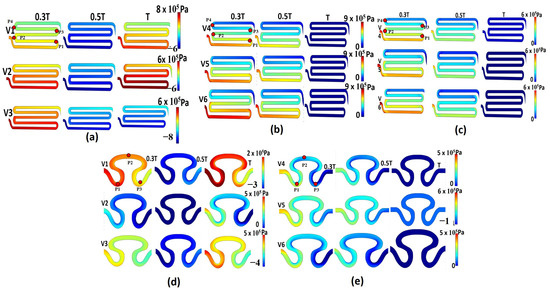 Hemodynamic parameters, including pressure, axial velocity, and shear rate, are important regulators that can impact cell growth. All S-shaped serpentine model analyses for the S1 model were grouped as I, II, and III, while the delta-shaped serpentine model analyses for the S2 model was grouped as conditions IV and V. No Newtonian study was added for the S2 model because the Newtonian model had shown significantly lower spatial variation for strain rate in comparison to non-Newtonian models in the S1 model. Hence, this model was not considered further in the study. Figure 3 represents the contour plot of pressure for all groups. For the non-Newtonian viscosity formulation with sinusoidal flow (model I, Table 2), maximum pressure of Pa and minimum pressure of were developed for inlet flow velocity condition V1 on its rear region 1 (P1) and neck region 2 (P2), respectively (refer to Figure 3a). It was observed that for all inlet velocity conditions in the S1 model, the pressure decreased as fluid flowed from the rear region 1 (P1) to the neck region 2 (P4) by the end of the complete cycle. This can be attributed to the development of localized Coriolis vortex formation due to the occurrence of abrupt angle of inclination on the downstream of the flow path. The contour plot of pressure for the non-Newtonian viscosity formulation with physiological flow (model II) is shown in Figure 3b. It was observed that in due course of time, the localized pressure value decreased with respect to space directed from the inlet to the outlet for inlet flow velocity conditions V4 and V5. For the Newtonian viscosity formulation with physiological flow (model III, Table 2), the magnitude of pressure was constant for all flow velocity conditions at the end of the study cycle. Maximum pressure of Pa was observed for all flow velocity conditions for model III (physiological flow with Newtonian viscosity of serpentine model 1, see Table 2). At the edge of neck region 1 (P2) of serpentine model S1 at the T/3 cycle, maximum pressures were identified, as shown in Figure 3c. The pressure contour of non-Newtonian viscosity formulation for sinusoidal flow of serpentine model S2 (model IV, refer Table 2) is shown in Figure 3d. It was observed that the maximum pressure gradient was obtained in the neck region P1 for inlet flow velocity conditions V2 and V3. Similarly, for inlet flow velocity condition V1, maximum pressure gradient of Pa was recorded in between the neck region (P1) and abdominal region (P2) of sample S2 at the end of the T cycle. For model V (physiological flow with non-Newtonian viscosity of serpentine model S2, refer Table 2), the contour plot showed pressure values ranging from Pa for inlet flow velocity condition V5 in the neck region P1, as shown in Figure 3e. For the other two flow velocities V4 and V6, the maximum pressure gradient was observed near the neck region P1. Overall, the results showed that for all flow boundary conditions, Newtonian fluid had a small pressure gradient, so it could easily flow through the channel. However, the pressure drop considering the non-Newtonian fluid flow formulation was substantially larger (Figure 3a,c). In contrast, the curvature of the fluid interface was maximum in the serpentine model S1, which produced a greater maximum pressure gradient compared to serpentine model S2, as shown in Figure 3a,d.