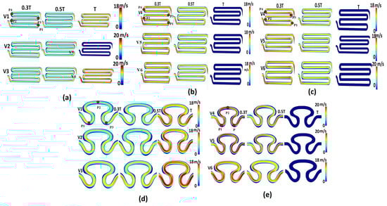 The flow pattern in a serpentine channel is not uniform, with areas of higher and lower pressure along its length. The channel geometry can influence the flow pattern, generating eddies or vortices, and change the axial velocity of fluid. The axial velocity contour profiles for all five models are shown in Figure 4. The magnitude of axial velocity for the non-Newtonian viscosity formulation with sinusoidal flow of sample S1 (model I, Table 2) was found to be maximum (20 mm/min) on the rear region (P1 and P2) and neck region (P1 and P2) for inlet flow velocity conditions V1 and V3 at the T cycle (Figure 4a). Similarly, the maximum (18 mm/min) velocity was observed at rear region P1 and the outlet region for inlet flow velocity V2. The contour profile of axial velocity of the non-Newtonian viscosity formulation with physiological flow of sample S1 (model II) had maximum axial velocity on the rear region (P1 and P2) and neck region (P1 and P2) at the T/3 time cycle, as shown in Figure 4b. From Figure 4c, it can be observed that the contour plot of axial velocity for the Newtonian viscosity formulation with physiological flow of serpentine model S1 (model III) was similar to the axial velocity obtained for the non-Newtonian viscosity formulation with physiological flow of serpentine model 2 (model V). Such observation might be due to the serpentine channel orientation effect, irrespective of the hematocrit model of the working fluid flowing through the serpentine channels. The maximum velocity (20 mm/min) for both models was developed for the V6 condition on the periphery of point P1 of both serpentine models at T/3 s. For the non-Newtonian viscosity formulation with sinusoidal flow of serpentine model S2, the local maximum axial velocity (18 mm/min) was recorded on the periphery of the neck region (P1) and the periphery of the rear region (P3 at the T cycle, as shown in Figure 4d). Similarly, for the non-Newtonian viscosity formulation with physiological flow of serpentine model S2, it was observed that variations in axial velocity were measured at T/3 and T/2 s for inlet flow velocity conditions V4, V5, and V6. As depicted in Figure 4e, the maximum axial velocity was generated on the periphery of the neck region (P1), abdominal region (P2), and rear region (P3) at T/3 for inlet flow velocity conditions V4 and V5. From Figure 4b,e, it can be seen that the serpentine model S1 tended to have lower axial velocities than serpentine model S2 due to the larger radius of the curvature. Similarly, it was observed that the non-Newtonian viscosity produced a greater maximum axial velocity compared to the Newtonian viscosity formulation, as shown in Figure 4b,c.