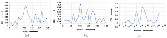 The value of OSI at different study points for serpentine geometries 1 and 2 were computed using Equation (5).