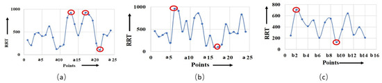 Calculated RRT for (a) model S1, Newtonian; (b) model S1, non-Newtonian; (c) model S2, non-Newtonian. The highlighted points show the maximum and minimum magnitude of RRT for respective models.