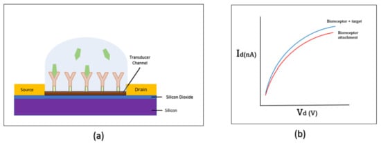 (a) Working principle of the FET biosensor. (b) I–V measurement of the FET biosensor.
