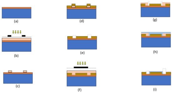Illustration of the fabrication flow ((a–i) in sequence) of the electrode: (a) a cleaned p-type silicon wafer, (b) application of photoresist and UV exposure on the exposed surface for patterning, (c) development of photoresist, (d) deposition of Cr/Au using the electron beam, (e) removal of photoresist and lift-off, (f) second mask application for patterning, (g) development of photoresist, (h) deposition of TEOS and (i) removal of photoresist.