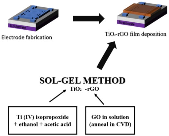 TiO2-rGO thin film was prepared using the solution–gel (sol–gel) method, based on the method developed in our previous work [2], by reacting with commercially available graphene oxide (GO) (Sigma-Aldrich, Darmstadt, Germany). TiO2-rGO of 0.06 v/v% was prepared based on previous work [29], with some modifications, as this is the optimum concentration for this application. Figure 3 represents the material synthesis and deposition process. The fabricated device was then coated with TiO2-rGO using the spin-coating process for 30 s at 2000 rpm. The coated device was then annealed in a furnace with argon flow at 100 sccm for 30 min. The thermal reduction process allows the reduction of GO to rGO and the transformation of the crystallinity of TiO2 from brookite phase to anatase, which reduces particle dislocation and improves conductivity.