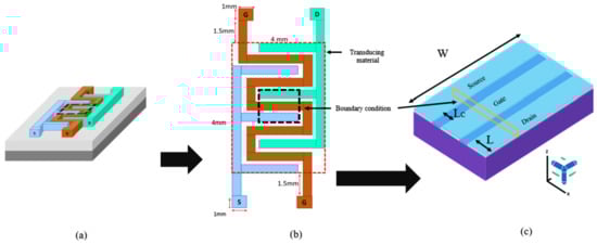 Pictorial representation of the simulated design: (a) schematic of the FET on a wafer with the source (S), gate (G) and drain (D), (b) schematic design from the top view and (c) design simulation in CTS for electrical characterisation with the electrode width (W) at the X, Y, Z view.