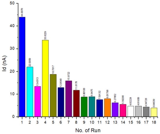 From the Taguchi design analysis set, the quality characteristics were determined by the term “larger-the-better”, which means the result of the SNR analysis with the highest Id value was targeted using Minitab-16 software. The improved performance of the sensor device was based on the larger current output, which denotes a higher conductivity. The conductivity of the channel in FET is a function of the potential applied across the gate and source terminals. From Figure 7, L1 showed the highest Id.