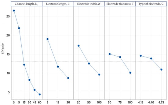 Table 8 shows the results of the ANOVA. The p-value for channel length (LC) was less than 0.05, which showed the most significant factor. However, the p-values of the other parameters were less significant compared to the channel length. These results show that even a slight change in the channel length will affect the drain current, Id. The percentage of contribution was observed to discover the factor significantly affecting the SNR of the output drain current, Id. Based on Table 8, channel length contributed the highest percentage (63.11%), followed by electrode length (17.87%), electrode width (9.93%), thickness of the electrode (0.82%) and type of electrode (2.67%), at a 95% confidence level. The percentage of error contribution was 5.6%, which means that all the factors significantly affected the SNR. According to the Taguchi method, to conclude whether all the important factors affected the response variable, the percentage of error contribution must be less than 50% [42].
