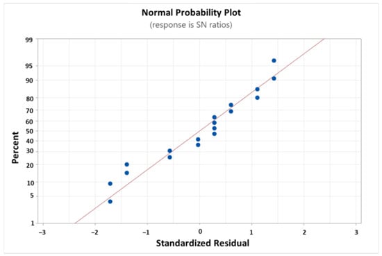 Figure 9 shows the standardised residuals in normal probability plots in Taguchi analysis in response to the SNRs. The data plot helps to assess the quality of the model and its ability to accurately fit the data. Figure 9 shows that the data did not deviate too far from a straight line, indicating that the simulation design model is acceptable.