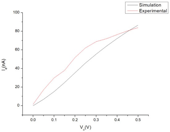 The current–voltage (I–V) measurements from the simulation and experimental measurements are shown in Figure 10 for the parameters under optimal conditions at a gate voltage (Vg) of 3 V. The drain voltage (Vd) was swept from 0 V to 0.5 V. Both graphs indicate a similar curve trend of n-type material behaviour due to a higher concentration of TiO2 in the nanocomposites. The curve difference between each graph was calculated at 28.7%. The are several factors that could be identified as the potential source for the 28.7% deviation. This could include the variations in the experimental conditions, some undefined conditions/parameters in the simulation model or the process of material synthesis.