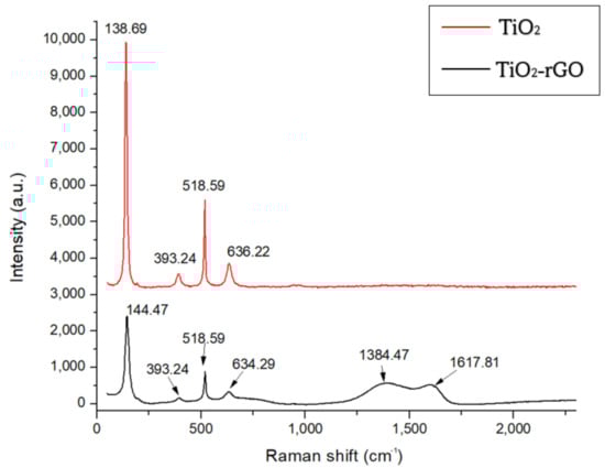 Raman spectra of TiO2 and the TiO2-rGO nanocomposite.