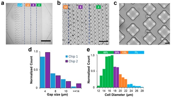 Physical trapping of A549 cells in microfluidics. (a) Bright-field image of the trapping device with vertical arrays of diamond micro-posts (scale bar: 1 mm). Based on the column spacing, the device comprises 4 different regions (marked with the green lines). The leftmost has a gap size greater than 14 µm and serves as a filtering device for cell aggregates. The two middle regions are designed with gap sizes of 10 µm and 8 µm to trap single cells. The arrays closer to the outlet are characterized by tiny spaces aimed at retaining highly deformable cells. (b) Bright-field image of A549 cells trapped in the arrays closer to the outlet (scale bar: 200 µm) with column spacing between 10 (leftmost arrays) and 4 µm (rightmost arrays). (c) A zoomed image of effective trapping in 8 µm gap size (scale bar: 20 µm). (d) Columns chart representing the normalized number of single cancer cells captured in two different chips for each column spacing. (e) Diameter distribution of A549 cancer cells. The histogram shows a correspondence between the diameter distribution of cells and their trapping distribution, with smaller cells being associated with trapping in smaller gaps closer to the outlet, while larger cells were trapped in the initial arrays with larger gap sizes. Green, purple, orange, and blue colors represent gap spacing of 4, 8, 10, and >14 µm, respectively.