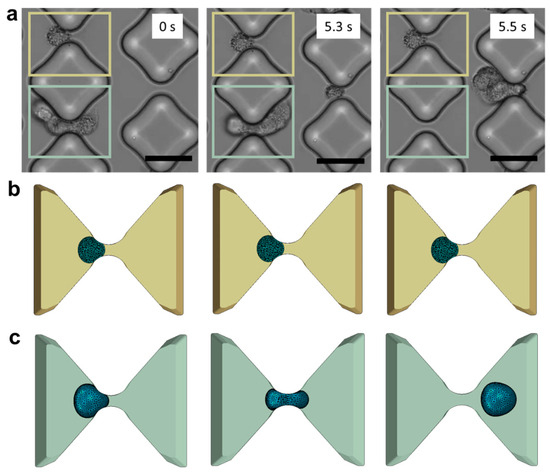 In vitro experiments vs. in silico models. (a) De-trapping progression of A549 cancer cells in the testing device (scale bar: 50 μm). Three consecutive frames capture the same device region and the same inter-pillars gap to illustrate a case of successful trapping (marked in yellow) and a case of de-trapping (marked in light green). (b) The corresponding phases trapping phases are illustrated in the numerical framework. (c) Cell deformability and tendency to elude the obstacles are well captured in the model.