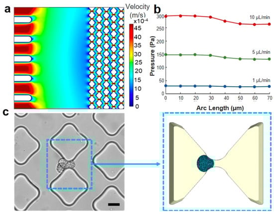Loading conditions and region of interest. (a) CFD simulation of the velocity distribution in the microfluidic trapping device, illustrating multiple traps. (b) CFD simulation of the pressure drop along the flow direction in a single trapping unit with a 6 μm gap across flow rates of 1, 5, and 10 μL/min. (c) The trapping unit area is depicted in an optical image of the experimental device (scale bar: 20 μm), and the same area is represented in the computational model reported on the right side. The simulation accurately replicates the smoothness of the pillar’s shape and the cell deformability when interfacing with the constraint.