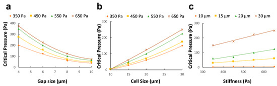To explicitly define the effect of the optimization parameters on the critical pressure, the critical pressure is plotted against gap size for various cell elasticity when the cell size is kept constant (a). Similarly, the gap size is maintained constant, and the corresponding curves are drawn for cell size at varying elasticity (b) and cell elasticity at varying cell diameters (c).