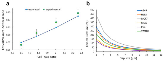 Experimental validation and potential application. (a) For gap sizes ranging from 6.8 to 9.8 µm, the critical pressure is plotted both for the experimental data reported by Balogh et al. [31] and ones estimated with our empirical model (Equation (1)). (b) Critical pressure is plotted for A549, MCF-7, MDA-MB-231, PC-3, HeLa, and SW-480 based on the morphological values reported in the literature (Table 1).