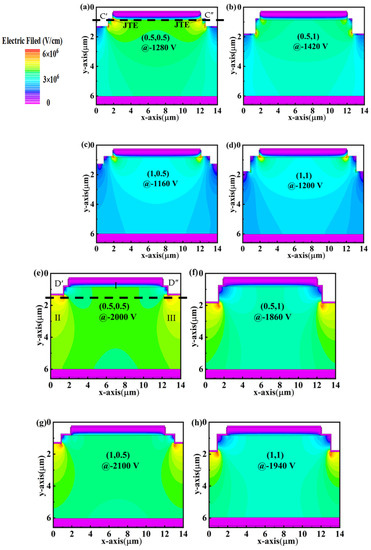 For comparison, we also evaluate the effect of JTE on the deeply etched mesa structures. The simulated electric field distributions under the VBD for the PNDs with different etching depths are shown in Figure 8. It is observed that the electric field is distributed at the interfaces of the JTE and p-n junction. When the etching depth is relatively small or large, the electric field tends to crowd around the JTE interface, especially the corner of the trench. On the other hand, the electric fields at the interfaces of the JTE and p-n junction merge together, resulting in the highest VBD, a maximum VBD of 2300 V (D = 0.5 μm). This value is comparable to that of the step device with (1, 0.5). Most of the electric field distribution shifts downward to the ohmic contact electrode when the etching depth is increased. Furthermore, the drift region that does not sustain the reverse bias becomes broad around the p-n junction interface with an increasing depth. Therefore, the degradation of VBD is ascribed to the suppressed effective drift layer thickness that sustains the bias. Also, we observe that the forward conduction current of the device decreases slightly with the increasing etching depth, which is attributed to the gradually suppressed conduction path. It can be seen that as the depth of etching increases, the electric field at the corners of the device gradually concentrates with a fixed reverse withstand voltage of 1100 V, which leads to a decrease in the withstand voltage performance (Figure 8h). Therefore, we found that the deeply etched mesa is not required for the step edge termination with the assistance of the JTE.