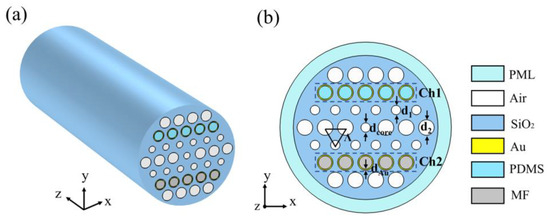 - Wang, D.; Yi, Z.; Ma, G.; Dai, B.; Yang, J.; Zhang, J.; Yu, Y.; Liu, C.; Wu, X.; Bian, Q. Two-channel photonic crystal fiber based on surface plasmon resonance for magnetic field and temperature dual-parameter sensing. Phys. Chem. Chem. Phys. 2022, 24, 21233–21241. [Google Scholar] [CrossRef]