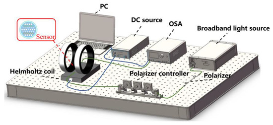- Peng, J.; Zhang, S.; Jia, S.; Kang, X.; Yu, H.; Yang, S.; Wang, S.; Yang, Y. A highly sensitive magnetic field sensor based on FBG and magnetostrictive composite with oriented magnetic domains. Measurement 2022, 189, 110667. [Google Scholar] [CrossRef]
