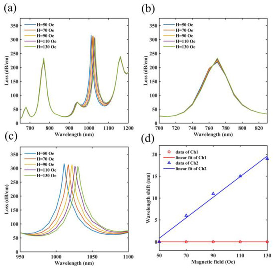 - Wang, D.; Zhu, W.; Yi, Z.; Ma, G.; Gao, X.; Dai, B.; Yu, Y.; Zhou, G.; Wu, P.; Liu, C. Highly sensitive sensing of a magnetic field and temperature based on two open ring channels SPR-PCF. Opt. Express 2022, 30, 39055–39067. [Google Scholar] [CrossRef] [PubMed]