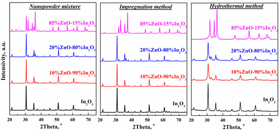Figure 1. Analysis of the XRD spectra of composites obtained by mixing powders and impregnation methods shows that the two synthesis methods lead to the formation of two-phase composites—ZnO-In