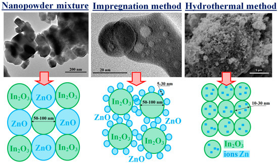 3 nanoparticles during impregnation. The low bond strength in the lattice of such clusters and their developed surfaces contribute to a decrease in the energy required for the formation of active oxygen vacancies. As a result, the concentration of active centers in the cluster significantly increases, which causes a higher sensor response when detecting hydrogen with an impregnated composite. The role of contacts between zinc and indium oxide nanoparticles having different electronic structures and morphologies was also observed in the detection of ethanol [