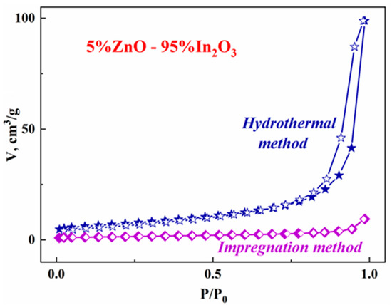 Figure 3). According to the IUPAC classification, the adsorption-desorption isotherms of the hydrothermal composite have a type IV shape with a hysteresis loop H3. Such a shape is typical of the mesoporous nature of the samples. At the same time, the desorption and adsorption isotherms for samples obtained by mixing nanopowders and the impregnation method (