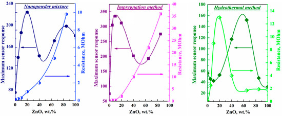 3: 0–20 wt.%, 20–85 wt.%, and above 85 wt.% ZnO. These sites differ in the effect of zinc oxide on the sensor response of the composite. Note that a similar pattern was previously observed in SnO