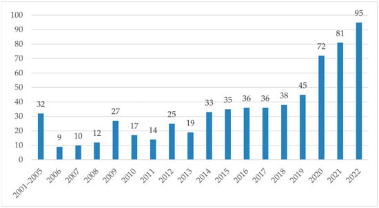 Using the Web of Science (WOS) database to search the literature using the keywords “flexible sensing technology” and “gesture recognition”, we find that there are related papers published every year and the number of papers is increasing. The literature growth trend of manipulator-control research based on flexible sensor technology over the years is shown in Figure 1. In the early stage, due to the immaturity of flexible sensing technology, the previous research mainly focused on machine-vision technology or the combination of flexible sensors and machine vision for gesture recognition, resulting in a small number of related research papers. In later stages, research on flexible sensing technology made some progress due to the continuous development of multidisciplinary fields, such as digital communication and artificial intelligence. Relevant interdisciplinary studies continue to emerge, eventually leading to a sharp increase in the amount of literature in this field.