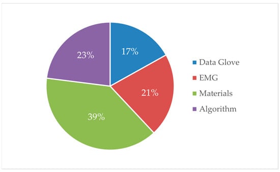 By searching the literature using the keywords “flexible sensing technology” and “gesture recognition” and adding the keywords “material”, “data glove”, “myoelectric”, and “algorithm”, a literature proportion distribution diagram can be obtained as shown in Figure 2. It can be seen from Figure 2 that 39% of the literature focuses on materials for manufacturing flexible sensors. This indicates a significant interest in how materials affect sensor performance. In addition, 23% of the literature is dedicated to algorithmic research by optimizing existing algorithms or creating new ones to address issues such as control and detection accuracy. However, there is no significant difference in the number of studies on the two different control methods, indicating that the search for optimal control methods is ongoing. However, recognition difficulty, sensitivity, recognition accuracy, and stability determine the quality of the control method. In order to solve these problems, relevant research is mainly carried out by improving the design scheme, upgrading the preparation materials, and optimizing the process flow. Through the design of the microchannel and microstructure, a flexible sensor with higher sensitivity, faster response, and more stable operation will be produced. It will also strengthen the research of some preparation materials and improve the control sensitivity and stability of flexible sensors by improving the properties of materials. The process directly determines the quality of design products and the exploration, improvement, and promotion of the process level is also an important issue that needs continuous research.