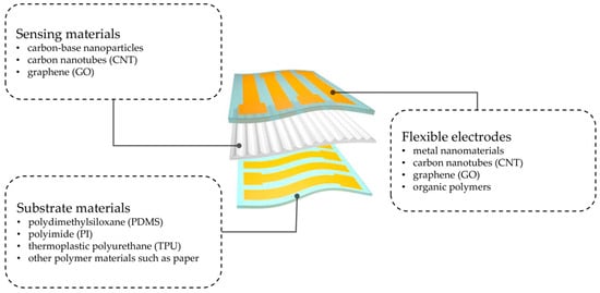As shown in Figure 3, commonly used substrate materials are mainly polydimethylsiloxane (PDMS), polyimide (PI), thermoplastic polyurethane (TPU), and other polymer materials such as paper; sensing materials are carbon-based nanomaterials (CBN), such as carbon-based nanoparticles, carbon nanotubes (CNT), and graphene (GO); and conductive materials are generally carbon nanomaterials, metal nanomaterials, organic polymers, and so on.