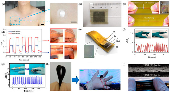 In addition, polyethylene terephthalate (PET) is also one of the commonly used polymers for manufacturing flexible sensors, it has good flexibility, excellent electrical insulation, and can maintain stable physical properties over a wide temperature range but its heat resistance is inferior to PI. Most of the substrate materials mentioned above are thermosetting resins and the flexible sensor parts made of them are difficult to recycle or degrade. With the widespread use of flexible sensors, a large amount of electronic waste will be generated. Therefore, in order to reduce the environmental impact, there is an urgent need for some renewable or recyclable materials, such as paper, as substrate. In addition, in some special applications of flexible sensors, paper, and some synthetic textiles are also a suitable choice as the base material of flexible sensors because this is likely to minimize the design complexity of the system. Liu et al. [35] fabricated a flexible and degradable paper-based strain sensor by dip-coating the paper substrate in an aqueous suspension of carbon black (CB) and carboxymethyl cellulose (CMC), as shown in Figure 4h. It has high stability and can be used to monitor various human movements. There are five major limitations of the current paper-based microfluidic system: (1) the conductors cannot be interconnected: holes must be drilled between the different layers of paper and the patterns on the different layers must be aligned so that the printed conductors can be connected between the different layers of paper; (2) the flow of water-based liquids is slowed down: conventionally printed carbon and silver electrodes are hydrophobic, which can cause their flow to slow down or stop; (3) paper surface area is limited: the viscous ink does not penetrate into the paper substrate, so the inner surface of the paper is not used; (4) poor contact adhesion and stability: The ink does not adhere well to the bare paper, and it is easily broken or torn; and (5) the blockage of the hole in the paper: after the electrode is printed on the paper, the aqueous solution cannot pass through the printed electrode. Hamedi et al. [38] demonstrated a technology fabric that overcomes these five limitations by fabricating circuits and microfluidic structures on paper. Hu et al. [36] used single-wall carbon nanotube (SWNT) inks to fabricate highly conductive textiles by an extremely simple “dip and dry” process, which exhibited excellent flexibility and stretchability, as shown in Figure 4i. Based on these flexible substrate materials, the flexible sensor has the characteristics of softness, stretchability, bendability, wearability, etc., and is widely used in smart textiles to stabilize and integrate multifunctionality beyond clothing [39].