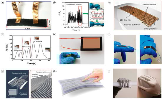 Graphene (GO) has the characteristics of being thin and transparent, having good electrical and thermal conductivity, and being a very promising flexible strain sensor material. Graphene has two preparation methods: the chemical vapor deposition method and the natural graphite stripping method. The graphene prepared by the chemical vapor deposition method [57] may have insulating impurities during the preparation process, resulting in poor electrical conductivity. Tolerable strain is usually less than 1%. The graphene prepared by the natural graphite stripping method has the advantages of large-scale production and low cost, which is more conducive to practical application [58,59,60]. As shown in Figure 5b, by transferring the obtained 3D graphene films (3D-GFs) to a flexible PDMS substrate, a reversible change in resistance under large strain or bending was achieved by Pan et al. [49]. The highly sensitized piezoresistive strain sensor can produce a fast response to finger bending. Polat et al. [50] used graphene sensitized by semiconductor quantum dots (GQDs) to construct a photosensitive wearable sensor for the material and a number of prototypes are presented for monitoring key physiological characteristics, including heart rate, arterial oxygen saturation (SpO2), and respiratory rate, as shown in Figure 5c.