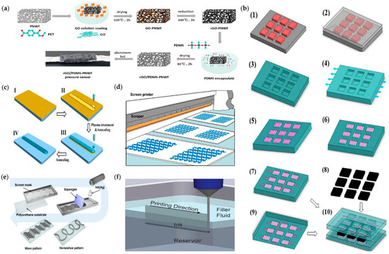 The dipping or coating process has been used in some of the previous literature. As shown in Figure 6a, Lu et al. [51] first dipped the polyester nonwoven fabric (PNWF) substrate in a GO solution, then reduced the coated GO–PNWF, and bonded the aluminum foil to the rGO–PNWF composite as an electrode. The rGO–PDMS–PNWF pressure sensor was prepared by combining the mixture of PDMS resin and hardener with the composite material, which can detect various physiological activities and subtle physiological signals. Ge et al. [71] provide an electronic fabric based on intertwined sensor electrodes, which has the ability to simultaneously map and quantify the mechanical stresses induced by compression, lateral strain, and flexion. This stretchable electronic fabric, with multiple force-mapping properties and high durability, has potential applications in wearable artificial skin for humanoid robotics, biomedical prostheses, and physiological analysis devices.