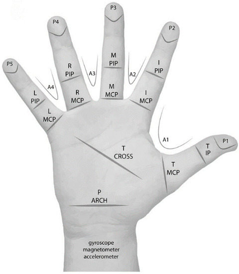 Labels and sensor locations of the VMG 30™ data glove proposed by Krammer et al. consisting of 29 sensors reprinted from [113], copyright (2020), with permission from PubMed Central.