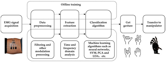 The movement intention issued by the brain triggers the excitation of the motor cortex of the brain, which sends movement instructions to the α motor neurons of the spinal cord and, then, transmits the relevant movement information to the muscles of the human forearm, resulting in the release of calcium ions in the muscles, causing the muscle to contract to produce a biological current, which reaches the surface of the skin through the tissue fluid and sebum, showing a current difference between the surface electrodes [158]. The EMG signal is collected by measuring the current difference through the electrode. Then, the signal is preprocessed and the feature is extracted to realize the functions of filtering and noise reduction. Finally, the data is trained and the pattern is classified. The classification results are sent to the manipulator, which performs the appropriate action by controlling the toggle drive motor. Like the human hand, the manipulator has five fingers, each finger is independently driven by a motor, and each finger joint is connected by a toggle mechanism. Upon receiving the signal, the controller drives the motor to rotate, which simultaneously drives the middle and the end joints to rotate, allowing the mechanical finger to bend and extend along a fixed path. The identification process is shown in Figure 9.