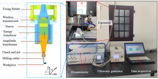Titanium has been in use since the early 1950s. The first Ti alloy used was TC4, which is also the most widely used Ti alloy at present globally. Ti alloys are widely used in aerospace and other fields [1,2] because of their high specific strength and good heat and corrosion resistance [3,4,5], such as the disks and blades of aero-engine fans and pressurizers, which can resist high temperatures of up to 400 °C [6,7]. Ti alloys are ideal metal composites. However, Ti alloys have strong chemical activity and high thermal conductivity, which makes them prone to frictional heat during machining. They also have high hardness, strength, and corrosion resistance, which makes them very likely to result in cutting chip fracture and blade cracking during machining, thus significantly affecting the efficient and precise machining of Ti alloys [8,9]. Ultrasonic-assisted milling (UAM) is based on the conventional milling (CM) method with the integration of ultrasonic vibration, which can convert high-frequency oscillation electrical signals into mechanical vibration using an energy transducer, thereby achieving intermittent cutting effect [10,11]. This technique can reduce the cutting force and improve the machining quality [12,13,14,15]. Recently, many studies have been conducted on the mechanism of UAM for Ti alloys. Sun et al. [16] investigated the relationship between ultrasonic power and frictional coefficient during UAM through cutting simulation and experiments. The results showed that compared with CM, UAM with the assistance of rotational ultrasonic vibration, had very small high-frequency signals and a lower frictional coefficient, indicating that increasing ultrasonic power reduced the frictional coefficient. Pang et al. [17] proposed longitudinal–torsional ultrasonic vibration milling for the surface machining of Ti alloys, with the advantages of high efficiency and high quality; the machined surface showed good integrity and regularity. Zhao et al. [18] studied the influences of different directions of ultrasonic vibration on Ti alloys. The results showed that axial vibration was more conducive to the formation of micro-texture on surfaces and the reduction of the cutting force, wear, and running-in time under the control of cutting speed and ultrasonic amplitude. Wei et al. [19] compared the roughness Ra of the surfaces machined using UAM and CM and found that UAM could reduce the milling force and improve workpiece quality.