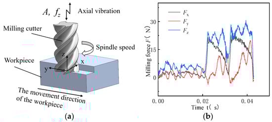 The trend of milling mode and force in ultrasonic vibration machining. (a) Schematic of axial ultrasonic vibration milling; (b) Trend of milling force in one cycle of ultrasonic vibration machining.