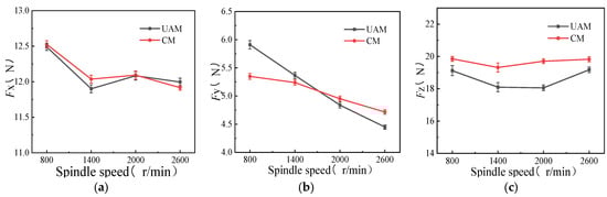 Comparative experiments were conducted for CM and UAM under different spindle speeds of 800, 1400, 2000, and 2600 r/min, with other variables remaining constant such as Table 3 (fz = 0.01 mm/z, ap = 0.2 mm, A = 3 μm). As shown in Figure 3, under constant feed per tooth, milling depth, and amplitude, UAM and CM showed the same decreasing trend of milling force on three axes with the increase in the spindle speed. As the spindle speed increased, the contact time between the cutter and the workpiece during cutting was shortened. Thus, the plastic deformation duration of the cutting area decreased, resulting in a decrease in the cutting force. Meanwhile, the flow rate of the metal material during cutting also increased, leading to more uniform plastic deformation and decreased cutting force.