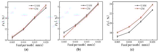 Comparative experiments were conducted for CM and UAM under different feed rates per tooth of 0.005, 0.010, 0.015, and 0.020 mm/z, with other variables remaining constant such as Table 3 (n =1400 r/min, ap = 0.2 mm, A = 3 μm). As the feed per tooth increased, both milling modes showed significantly increasing milling force on the x-, y-, and z-axes (Figure 4). This was because the cutting area of the cutter increased and the amount of materials removed increased with the increase in the feed per tooth. Additionally, the cutter wear increased due to the increase in plastic deformation of the material, hence requiring more cutting force to ensure cutting quality and machining efficiency. Therefore, the milling force showed an overall increasing trend.