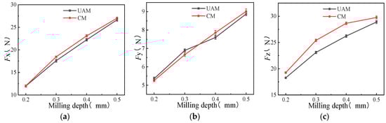 Comparative experiments were conducted for CM and UAM under different milling depths of 0.2, 0.3, 0.4, and 0.5 mm, with other variables remaining constant, such as Table 3 (n =1400 r/min, ap = 0.2 mm, A = 3 μm). As shown in Figure 5, both milling modes showed increasing milling force on the x-, y-, and z-axes with the increase in the milling depth. The increment tends of milling force generated using UAM and CM increased first and then decreased on the x- and z-axes, with a milling depth of 0.3–0.4 mm as the demarcation point. The maximum reduction rate of the milling force under ultrasonic vibration on the x- and z-axes was 4.34% and 9.41%, respectively. A milling depth of 0.3–0.4 mm was also taken as the demarcation point on the y-axis, but the ability to reduce the milling force of UAM was not as good as that of CM in the beginning but subsequently exceeded that of CM.