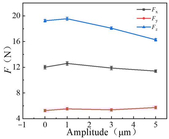 Effects of amplitude on triaxial milling force on three axes. (n = 1400 r/min, ap = 0.2 mm, fz = 0.01 mm/z).