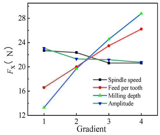The Fx range is depicted in Table 6, and its trend is shown in Figure 7. The milling force Fx on the x-axis increased with the increase in the feed per tooth fz and milling depth ap, t, but Fx only indicated slight fluctuations with the increase in n and A. Based on the range of Fx, R(ap) = 15.495 > R(fz) = 9.648 > R(A) = 2.3 > R(n) = 2.074. Therefore, the effects on the milling force in the milling plane were in the order ap > fz > A > n. The optimized combination was found to be A3B1C1D5 (n = 2000 r/min, fz = 0.005 mm/z, ap = 0.2 mm, and A = 5 μm) based on the aforementioned analysis, as the combination of the machining parameters could effectively reduce the milling force on the x-axis. Fx was 9.922 N under the optimized parameter combination based on the verification tests conducted using the aforementioned data, which was lower than all the values obtained in the orthogonal test. The maximum and minimum reduction rates of Fx were 70.81% and 11.77%, respectively, validating the optimized combination obtained in the orthogonal test.