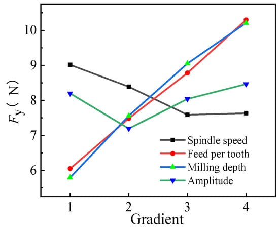 The range of Fy is depicted in Table 7 and its trend is shown in Figure 8. As observed, R(ap) = 4.420 > R(fz) = 4.251 > R(n) = 1.428 > R(A) = 0.552. The effects on the milling force in the milling plane were in the order ap > fz > n > A. The optimized combination was A3B1C1D2 (n = 2000 r/min, fz = 0.005 mm/z, ap = 0.2 mm, and A = 1 μm) based on the aforementioned analysis, as the combination of the machining parameters could effectively reduce the milling force on the y-axis.