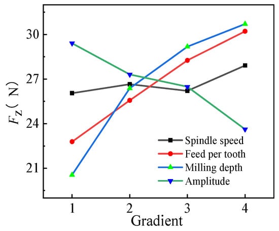 The range of Fz is depicted in Table 8, and its trend is shown in Figure 9. As observed, R(ap) = 10.152 > R(fz) = 7.431 > R(A) = 5.791 > R(n) = 1.868. Therefore, the effects on the milling force in the milling plane were in the order ap > fz > A > n. Meanwhile, the ranges of ultrasonic amplitude and feed per tooth were similar, indicating increased effects of ultrasonic amplitude on the z-axis. Therefore, the optimized combination was A1B1C1D4 (n = 800 r/min, fz = 0.005 mm/z, ap = 0.2 mm, and A = 5 μm), as the combination of the machining parameters could minimize the milling force on the z-axis.