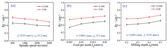 In this experiment, fz and ap remained constant at 0.01 mm/z and 0.2 mm, respectively. When n was relatively low, the cutting speed was relatively slow, the cutting chips were relatively large, and the surface roughness was relatively high. As n increased, the cutting speed increased, and the cutting chips became finer resulting in a smoother surface and reduced surface roughness. As shown in Figure 10a, when n increased from 800 to 2600 r/min, the roughness of CM and UAM reduced by 18.03% and 17.02%, respectively; when n was 2000 r/min, the roughness of UAM was reduced by the largest amount of 0.14 μm, with a reduction rate of 25.93%, compared with that of CM.
