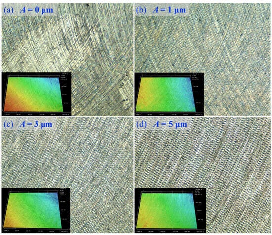 Surface morphologies of Ti alloys under different amplitudes. (a) The surface morphology at CM (amplitude A = 0 μm); (b) The Surface morphology at amplitude A = 1 μm; (c) The Surface morphology at amplitude A = 3 μm; (d) The Surface morphology at amplitude A = 5 μm.